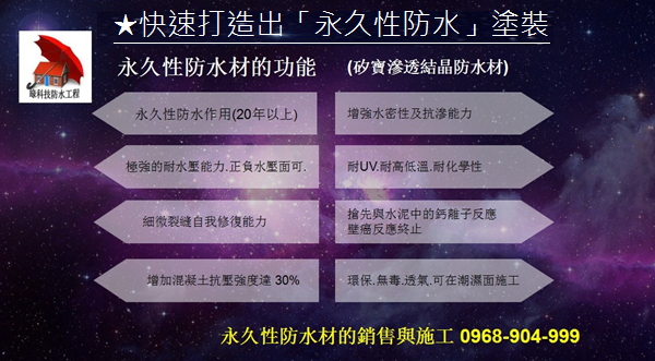 本工程以「滲透結晶型防水材」結合傳統防水膜工法之複合式防水施工法.經過數年來施作與統計.二項技術的結合與互補.自動形成一項具備防水+堵漏+補強三大功效的超級防護塗層.能夠抵抗各種化學物質的侵蝕、抗酸鹼.抗高低溫,抗凍融。抗氧化、抗碳化、抗氯離子的危害。能長期承受強大水壓,遇水後有自我裂縫修復的能力,遇到水又可以二次、三次等多次產生結晶,修補裂縫.快速提升防水戰力達99%
