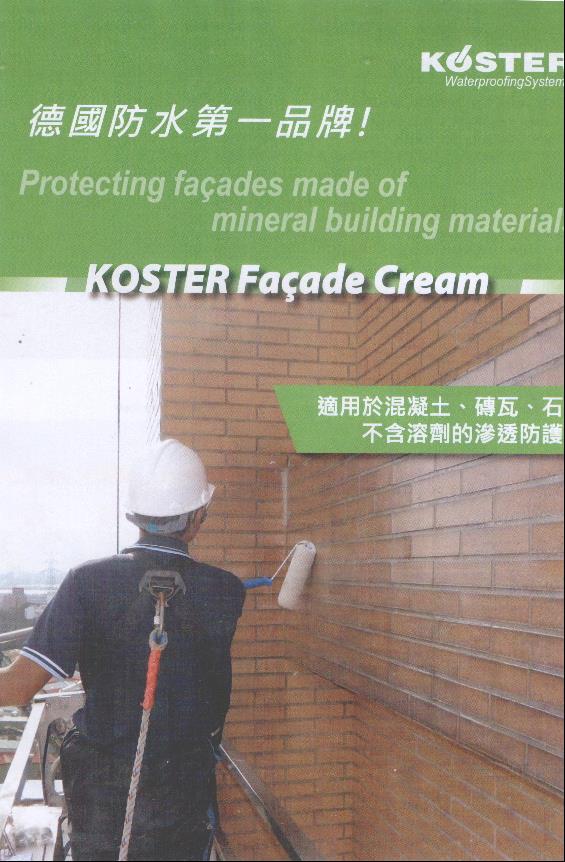 KOSTER facade cream (外牆高滲透防護乳膏) 10/31/202511/01/2025looogji 1.良好透氣性室內不生壁癌2.不黃變3.白色乳膏.完成後透明無色4.20分鐘形成防雨性能5.一道工序完成施作6.高亢鹼性耐候性優7.德國高品質防水產品 歐盟認證