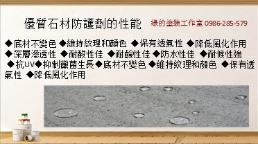 石材防護工程 10/18/201904/11/2023looogji 德國氟碳漆防護工程 適用.大理石.花崗石.砂岩石.板岩石、觀音山石、萊姆石等石材防護工程 氟碳漆功能:耐水、防腐蝕、抗汙染、高耐候性、永保長久如新。 施工步驟 1.施工架架設(採取鷹架或吊車) 2.高壓水清洗 3.非施作面屏蔽防護 4.噴塗德國SINO2500zj6石材防護劑2道. 註:新製品需先施作石材六面防護.