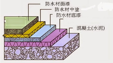 一般傳統防水工法:底漆中塗漆與面漆3道漆