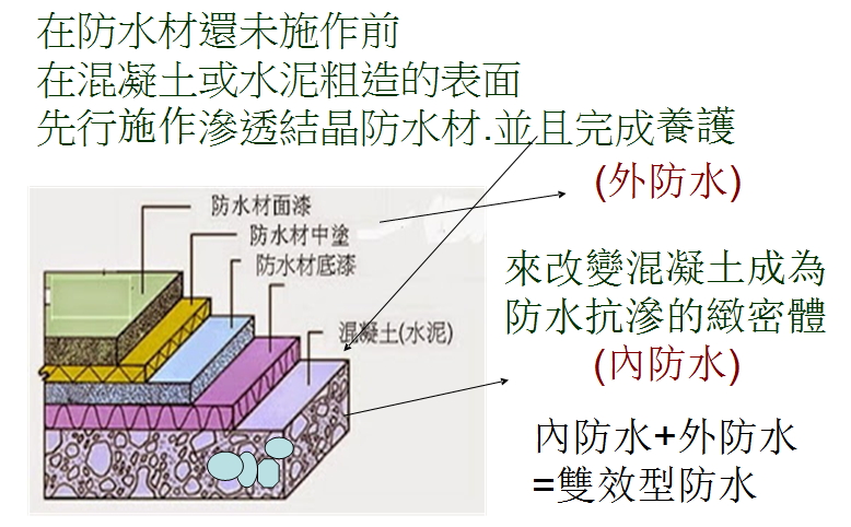 混凝土永久性防水工法 對牆體防水施作的方式-是以傳統防水工法為基礎.作為混凝土外防水之防護.加上在防水材尚未施作前.施作面先行施作滲透結晶防水材(水泥基防水材CCCW或深層滲透防水劑DPS).改變混凝土成為由內往外的永久性防水抗滲致密體.達到內外雙效型防水.來增強對混凝土防水之防護.