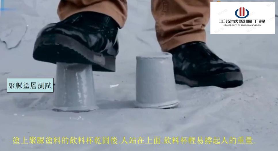 中圖:飲料杯用腳踩踏.保證立即踩扁.當塗上聚脲塗料的飲料杯乾固後.人站在上面.飲料杯輕易撐起人的重量.