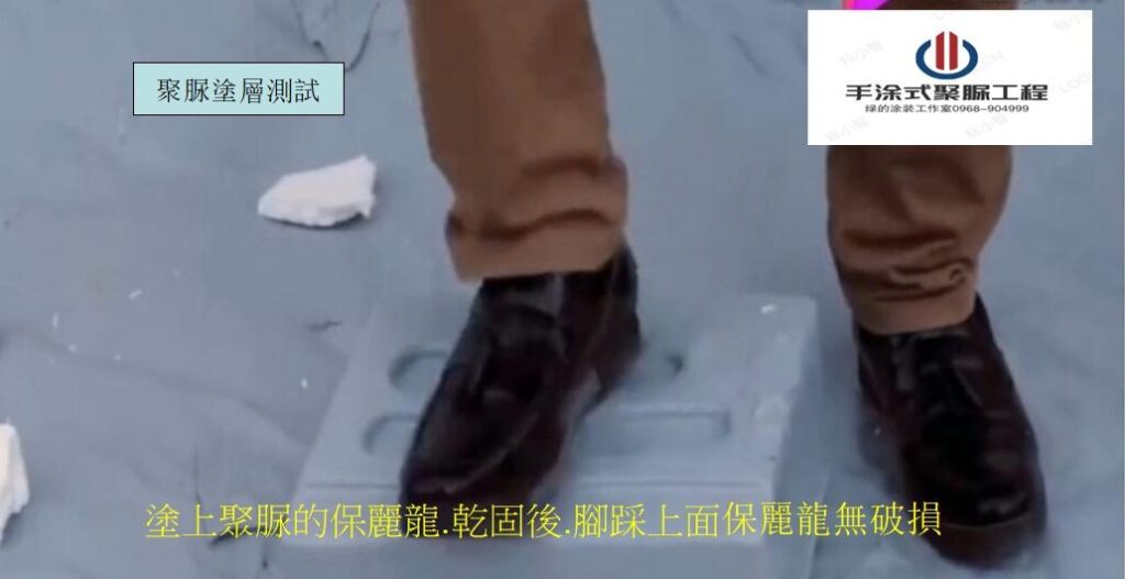 下圖:保麗龍用腳踩踏.保證踩壞.當塗上聚脲塗料的保麗龍乾固後.人站上去就是踩不破.更多資料點集:聚脲塗層測試