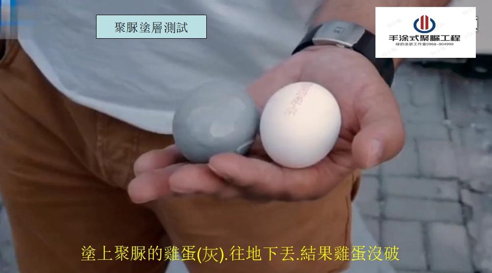 上圖:在雞蛋表面噴塗聚脲.乾固後將這顆蛋用力往地下丟.雞蛋不會破